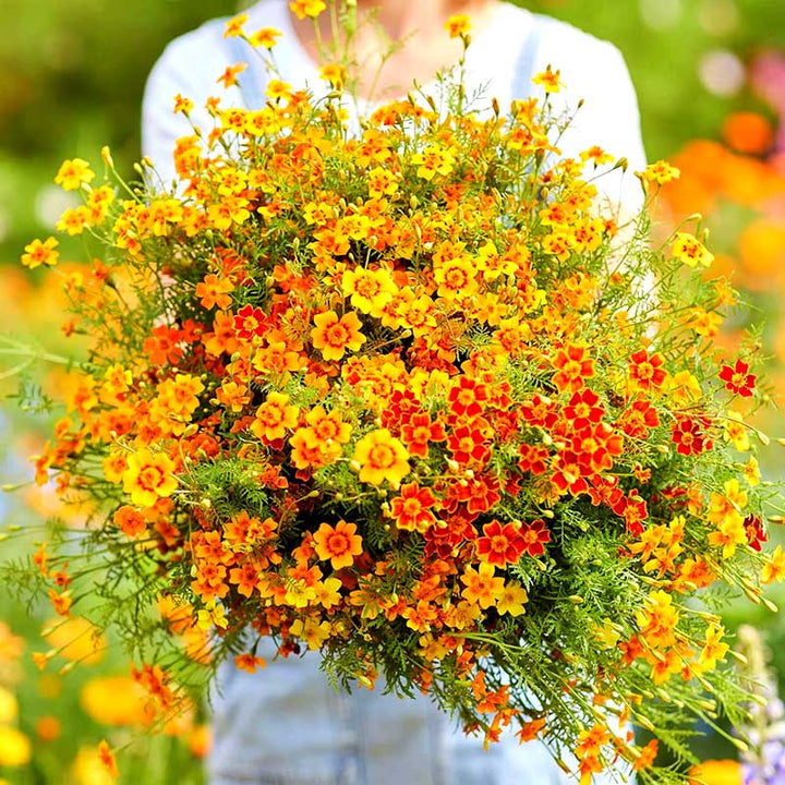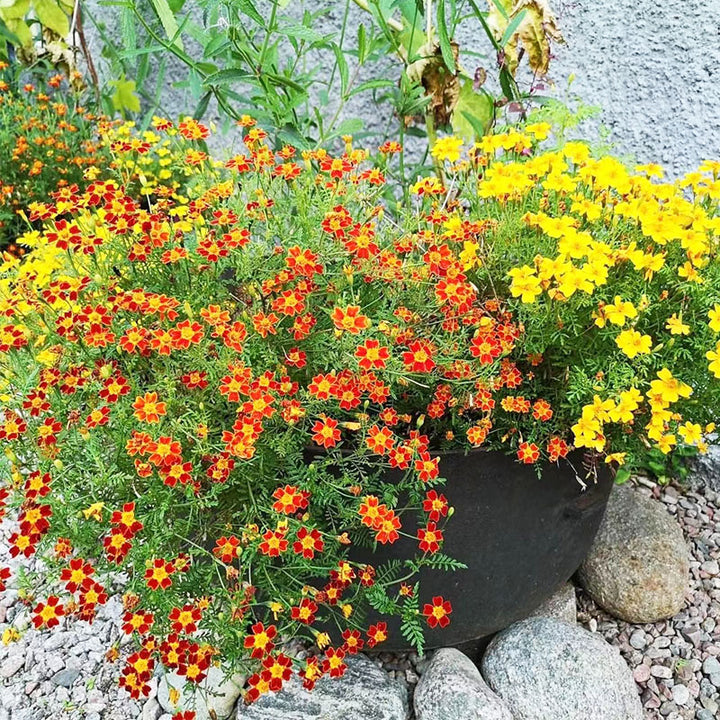 All very uniform in habit and bloom time, these colors are dazzling alone or in a mixed planting. They're a great choice for beds, borders, and containers of all types, including window boxes. They keep their bright color over a long season, and their high bud count means that you'll enjoy many flushes of fresh bloom. Superb for edging, they are even effective in vegetable gardens, where they repel nematodes naturally. And where marigolds go, butterflies follow.