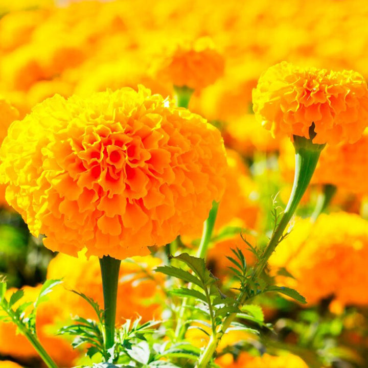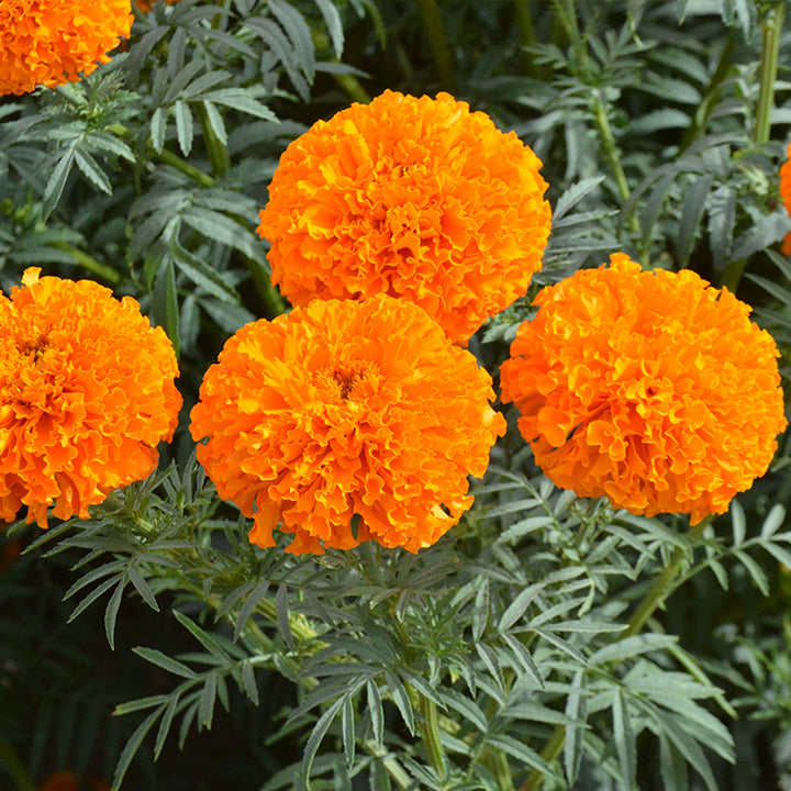 These bright orange flowers are simply stuffed with short, quilled petals, so symmetrical and beautifully rounded that they scarcely look real. A closely-spaced planting of Park's Whopper is a real delight, because when the plants begin blooming, you literally have a solid wall of flowers—no foliage or ground visible in between.