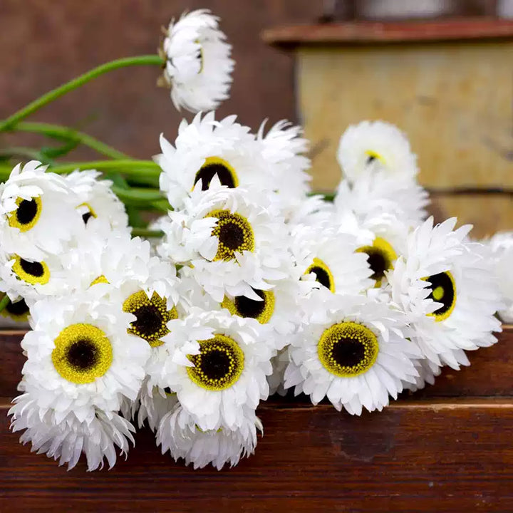 Pierrot White provides a distinctive, moody look for both cut and dried florals, though the plant stature is a bit short for cutting (approximately 18-24"). Productive plants produce relatively small, 1–2" upward-facing, daisy-like flowers with papery petals. The flowers have a long vase life and also make excellent dried flowers. Plants are basal branching, which makes the thin, wiry stems easy to cut and strip. Helipterum is also known as Acroclinium, immortelle, paper daisy, Australian everlasting, and everlasting daisy.
